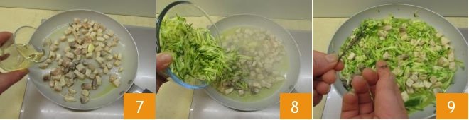 let them brown for 1 minute, stirring, then deglaze with the white wine 7, let it evaporate for a few moments, and then add the julienned zucchini 8, salt, pepper, and cook for 4-5 minutes, stirring occasionally. Then turn off the heat and scent with fresh thyme leaves 9,