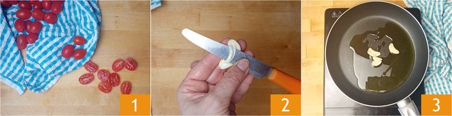 To prepare fusilli with tuna and cherry tomatoes, start with the sauce. Wash, dry, and cut the cherry tomatoes in half 1. Peel the garlic, cut it in half, and remove the core 2. Place the garlic cloves in a pan with a drizzle of oil and let them brown 3.