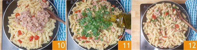 Mix, add the tuna 10, the parsley, the basil, and a tablespoon of extra virgin olive oil 11. Mix well, turn off the heat, and serve 12.