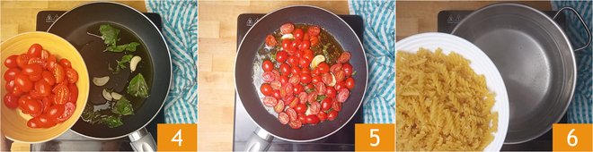 Add some of the basil leaves, torn by hand, and add the cherry tomatoes 4, with a pinch of salt. Cook the tomatoes until they become soft and release their juice, about 10 minutes 5. You can then remove the garlic. Meanwhile, cook the fusilli in plenty of boiling salted water, to your liking 6.
