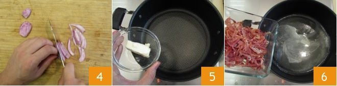 Peel and slice the shallot 4. Now, in a pan, melt the butter over low heat 5 and add the previously cut prosciutto 6.
