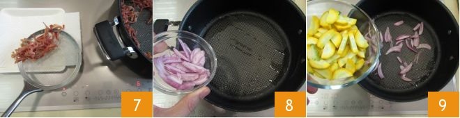 Toast the prosciutto for about 6 minutes and when it is crispy, transfer it to a tray covered with paper towels 7 to absorb the excess fat. In the same pan, add the shallot 8 and the zucchini 9.