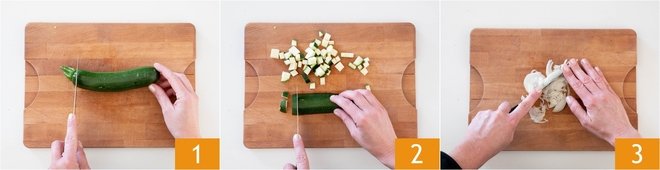 To prepare the pasta with zucchini and ham, first take care of the zucchini. After washing them, remove the ends 1 and cut them into cubes 2. Finely chop the onion as well 3.