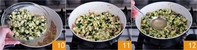 Add the zucchini 10 and let them flavor for a few minutes, then salt and continue cooking 11. When the zucchini starts to dry, add a ladle of broth 12.