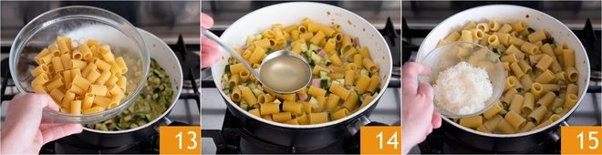 Continue cooking until the zucchini is soft; it will take another 10 minutes. Add the pasta 10 and cook it as if it were risotto, adding a ladle of broth as needed 14: in this technique, the cooking time is longer than indicated on the package. When the pasta is cooked, turn off the heat and add the grated Grana cheese 15.