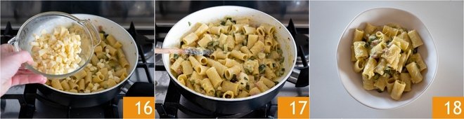 Add the diced provola cheese 16 and stir until completely melted. Add a drizzle of raw oil and serve it 18.