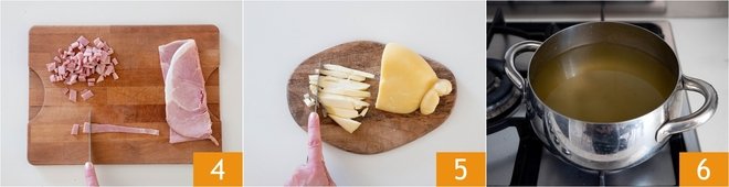 Cut the cooked ham into cubes 4 and the scamorza cheese as well 5. Heat the vegetable broth 6.