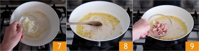 Pour a drizzle of oil into a large, high-sided pan and add the onion 7, let it soften 8, then add the cooked ham and let it brown for a couple of minutes 9.