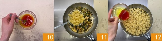 Add another ladle of cooking water 13 and a drizzle of oil 14. Mix everything well and finally stir in the grated Grana cheese 15.