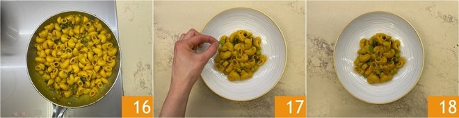 Sauté once more 16 and plate. Decorate with fresh mint leaves 17 and immediately serve your pasta with zucchini and saffron piping hot 18!