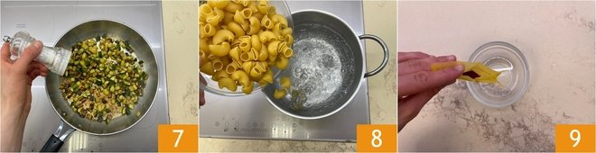 Then season with salt 7, turn off the heat, and keep warm. As soon as the water boils, toss in the pipe rigate 8. Dissolve the 2 sachets of saffron in a little warm water 9.