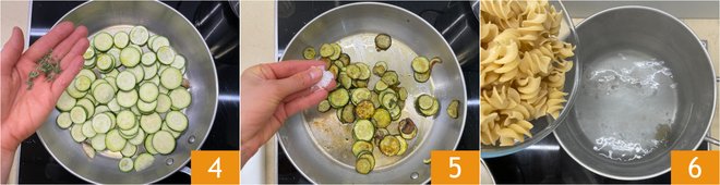 Fragrance with thyme leaves 4 and sauté over medium-high heat for about 5-7 minutes, then salt 5. Set aside a few zucchini for plating and keep the others in the pan. Meanwhile, bring a pot of salted water to a boil and cook the fusilloni until al dente 6.