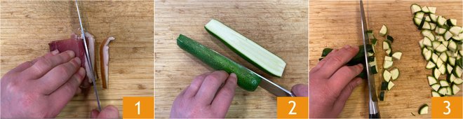 To prepare pasta with zucchini, speck and gorgonzola, first put a pot of water on the heat to cook the pasta. Cut the speck into thin strips 1. Trim the zucchini and cut them in half lengthwise 2, then dice them 3.