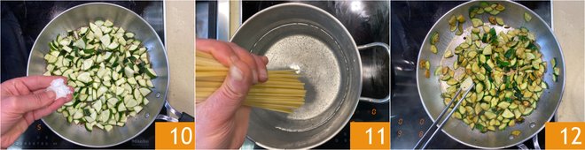 Season with salt 10 and cook over medium heat for about ten minutes. Meanwhile, drop the linguine into the boiling salted water 11. Once the zucchini are cooked, remove the garlic 12 and lower the heat.
