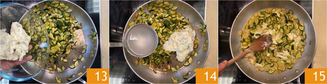 Add the gorgonzola 13 and about 1 ladle of the pasta cooking water (about 1/2 cup / 4 fl oz) 14. Stir to gently melt the gorgonzola 15.