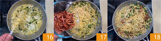 Drain the pasta al dente and transfer it to the pan 16, then add the crispy speck 17 and toss well to combine 18.