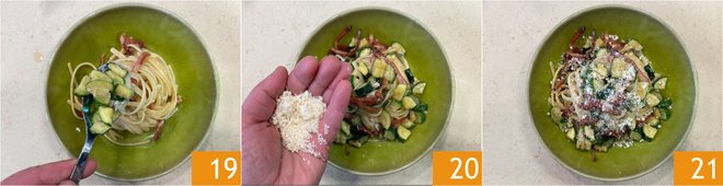 Plate 19 and finish with grated cheese to taste 20. Your pasta with zucchini, speck and gorgonzola is ready to be served 21!