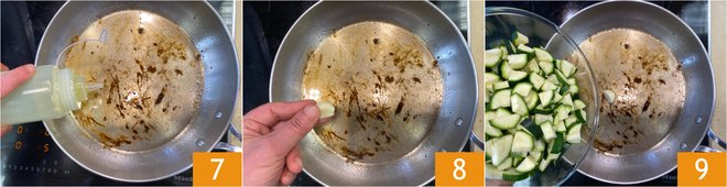 In the same pan add a drizzle of olive oil 7 and a clove of garlic 8, then add the zucchini 9.