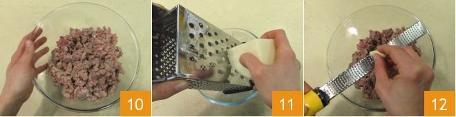 Transfer the browned meat to a bowl and let it cool 10. In the meantime, grate the caciocavallo with a coarse grater 11. Once cooled, add a grated clove of garlic to the meat 12,