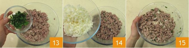 chopped parsley 13 and caciocavallo 14, and mix well to combine 15.