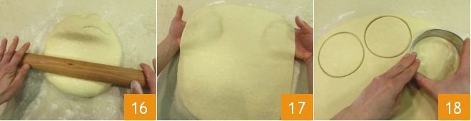 After the rising time, take the dough and roll it out on a lightly floured surface 16 until you get a rectangle of 18.5x15.75 inches with a thickness of about 1/12 inch 17. Cut out discs using a 4.75-inch diameter cutter 18, then re-knead the scraps and roll out the dough again to cut out more discs until you have a total of 18 pieces.