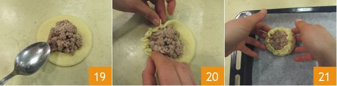 Stuff each disc by placing a tablespoon of filling in the center 19 and close it by lifting the edges and pinching them with your fingers to create a scalloped edge 20. As they are ready, place the pies on a baking sheet lined with parchment paper 21.