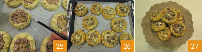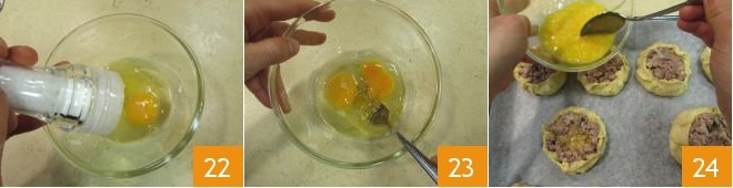 At this point, crack the eggs into a bowl, season with salt 22 and pepper, and beat with a fork 23. Pour some of the eggs over each pie, making sure the liquid does not spill out: you can use your hands to help it penetrate into the meat, at least partially 24.