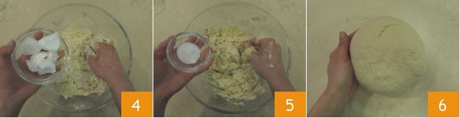 Also add the lard 4 and salt 5 and knead to combine all the ingredients, then transfer to the work surface and continue kneading until you get a smooth and elastic dough 6. Shape the dough into a ball and place it in the bowl, cover with plastic wrap, and let rise at room temperature for at least an hour.
