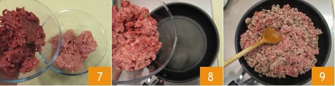 In the meantime, you can start on the filling: combine the two types of ground meat in a bowl 7 and mix with your hands to combine them. Pour the meat into a pan 8, add salt, pepper and sauté for a couple of minutes over medium heat, being careful not to overcook or completely crumble it 9.