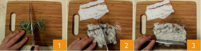 To prepare the pastries with lard spread, start with the rosemary: finely chop a sprig; then move on to the Colonnata lard; cut the slices into strips and then into even smaller pieces (2-3).