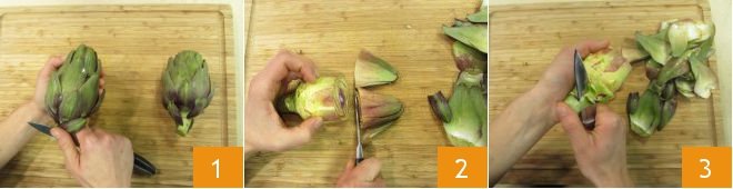 To prepare the artichoke pâté, start by cleaning them by removing the outer leaves 1. Once you reach the heart, cut off the tip 2 and remove the outer layer of the stem 3.