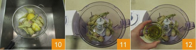Drain the artichokes 10, remove the lemons, and let them cool. Pour the artichokes into a blender 11, add the oil 12,