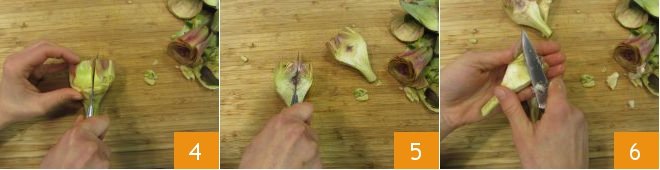 Cut the artichokes into quarters (4-5), remove the choke in the center 6