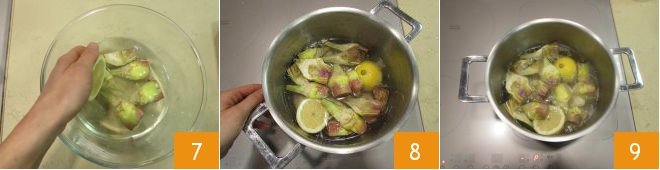 and gradually immerse them in water along with the juice of two squeezed lemons 7. When you have finished cleaning the artichokes, transfer everything to a saucepan 8 and cook for about 20 minutes 9.