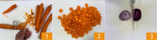 To prepare the pea and carrot omelet, peel the carrots 1 and cut them into slices about 3/16-inch thick 2. Clean and slice the onions 3.