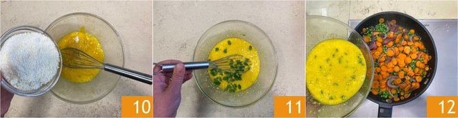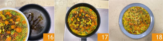 Reverse the pan with a quick and firm movement, letting the flipped omelet slide back into the pan 16. Cook on the other side for about 5-8 minutes 17. The pea and carrot omelet is ready 18.