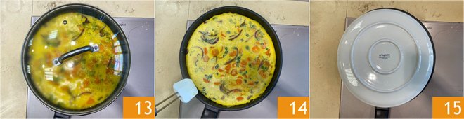 Cover with a lid 13. Lower the heat and cook for about 10 minutes. When the surface is slightly soft but still moist 14, flip the omelet with the help of a flat plate 15.