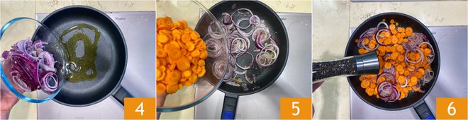 Now, in a skillet with a diameter of 11 inches (measured at the surface, 9.5 inches at the bottom), pour a drizzle of oil and add the onions 4. Cook over low heat for 5 minutes. After 5 minutes, add the carrots 5 and cook for about 10 minutes, still over low heat. Add pepper 6
