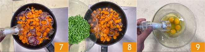 and salt 7. Now add the peas 8 and cook everything together for another 10 minutes. Meanwhile, in a bowl, beat the eggs with salt 9,