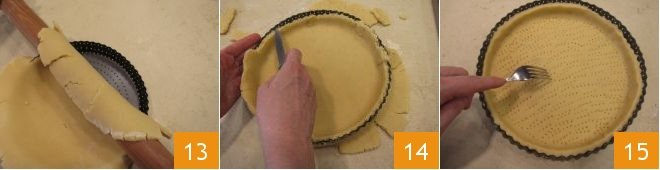 Line a 9.5-inch diameter tart pan 13, trim the excess pastry with a knife 14 and set it aside. Prick the bottom of the tart with the tines of a fork 15,