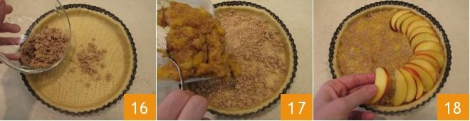 and crumble 1.4 ounces of amaretti on top 16, which will help absorb the fruit's juices generated during baking. Then add the peach and amaretti mixture 17, spreading it evenly and arrange the peach slices in a radial pattern,