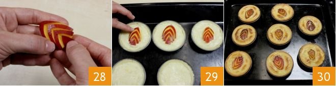 At this point, gently slide the peach pieces down with your fingers 28; you should have formed a spike. Place it in the center of each tartlet 29 and bake them in a preheated static oven at 340°F for 45-50 minutes (if using a convection oven, bake at 320°F for 40-45 minutes). Take them out of the oven when the edges of the tartlets are golden 30. Unmold and serve your warm peach and cream tartlets!
