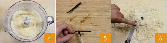 Then activate the mixer until you obtain a sandy mixture 4. Transfer it onto a pastry board or a cool working surface. Then take half of a vanilla pod, extract the seeds with the tip of a knife 5, and add them to the sandy mixture 6.