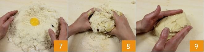 Form the classic fountain shape and pour the egg yolk in the center 7; briefly knead everything by hand 8 until you get a smooth and homogeneous dough 9 shaped into a loaf.