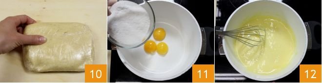 Wrap it with plastic wrap 10 and let it cool in the refrigerator for at least half an hour. Meanwhile, prepare the cream: in a large pot, pour the egg yolks and add the sugar 11, mix over very low heat with a whisk until the sugar dissolves 12.