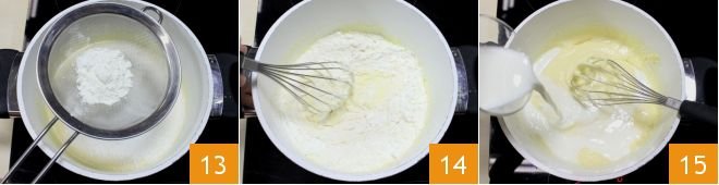Then add the cornstarch and flour by sifting them in gradually 13 and continue mixing with the whisk to obtain a homogeneous and lump-free mixture 14. At this point, add the milk at room temperature 15 and the cream slowly, always stirring with a whisk.