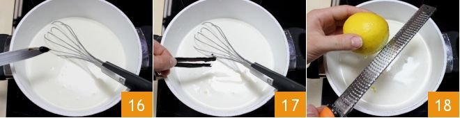 Take the other half of the vanilla pod, cut it with the knife and extract the seeds to add to the cream 16, then immerse the half-open pod split in two 17. Finally, grate the untreated lemon zest directly into the pot 18.