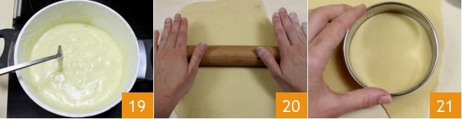 Continuously stir with the whisk and let the cream cook over very low heat for at least 15 minutes or until the cream reaches a creamy and compact consistency like custard 19. Then turn off the heat, let the cream cool slightly, and transfer it into a piping bag. At this point, take the shortcrust pastry from the refrigerator and place it on a floured working surface or pastry board. Roll it out with a rolling pin until it reaches a thickness of half an inch 20 (if the shortcrust pastry tends to break, place it between two sheets of lightly oiled parchment paper and roll it out with the rolling pin). Then use a pastry cutter to cut out 8 discs about 3.5-4 inches in diameter 21.