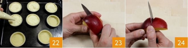 Place the obtained discs into molds with a diameter of 3 inches previously buttered and floured. Line each mold well with the pastry, adhering to the bottom and sides. Take the piping bag with the cream and fill each mold to the edge 22; then place them in the fridge to cool: this way, you will prevent the shortcrust edges from collapsing inward during baking. Meanwhile, prepare the peach decoration: cut them into 4 wedges 23 and then in half widthwise 24.