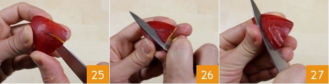 Starting from the wide base, make a small oblique incision in the center as if to form an upside-down V (25-26). Leaving a few millimeters of space, make more V-shaped cuts; repeat the operation until almost reaching the end of the peach quarter 27.
